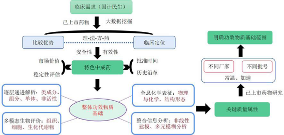 在中醫(yī)藥理論的指導(dǎo)下,構(gòu)建逐層遞進(jìn)、多層解析、綜合評(píng)價(jià)的化學(xué)物質(zhì)基礎(chǔ)研究策略和流程,采用現(xiàn)代分析技術(shù)手段,對(duì)已上市藥物和制備樣品的不同組分進(jìn)行活性對(duì)比研究,明確已上市中藥組方的核心物質(zhì)成分基礎(chǔ)和非活性成分群,確定已上市藥物的關(guān)鍵質(zhì)量屬性,構(gòu)建已上市藥物合理的功效化學(xué)物質(zhì)基礎(chǔ)指紋圖譜和限度范圍,是同名同方藥物的創(chuàng)制的核心方向。以Q-Marker理念貫穿藥材基原、前處理工藝、提取工藝、制劑成型工藝等環(huán)節(jié)的系統(tǒng)對(duì)比分析和研究之中,加強(qiáng)藥材、飲片、中間體、制劑等全過(guò)程質(zhì)量控制,全面評(píng)價(jià)和控制同名同方藥整體質(zhì)量,切實(shí)提升同名同方藥物的質(zhì)量控制水平。