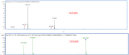 以天然產(chǎn)物二級(jí)質(zhì)譜庫(kù)為依托,鑒定分析藥物原型成分,再通過(guò)高分辨質(zhì)譜提取各化學(xué)成分的精確質(zhì)荷比等信息對(duì)代謝產(chǎn)物進(jìn)行辨識(shí)研究,從而分析藥物代謝途徑,明確藥物代謝過(guò)程,為藥物物質(zhì)基礎(chǔ)研究打下基礎(chǔ)。