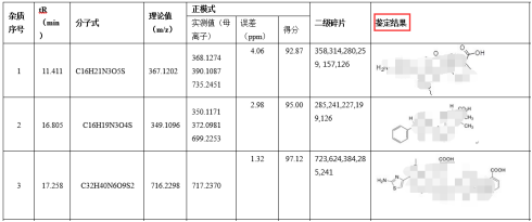 通過(guò)精確質(zhì)量、同位素豐度比、同位素精確質(zhì)量比及MS/MS四維信息關(guān)聯(lián)分析給予推測(cè)分子量、分子式,部分化合物可通過(guò)譜庫(kù)鑒定給予結(jié)構(gòu)式。