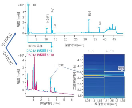 對(duì)于中藥復(fù)雜組分鑒定而言,二維液相串聯(lián)高分辨質(zhì)譜系統(tǒng)的優(yōu)勢(shì)在于,可在二維使用不同選擇性的色譜柱和色譜條件,使一維共流出的成分在二維得到較好分離,并進(jìn)入高分辨質(zhì)譜進(jìn)行鑒定分析。